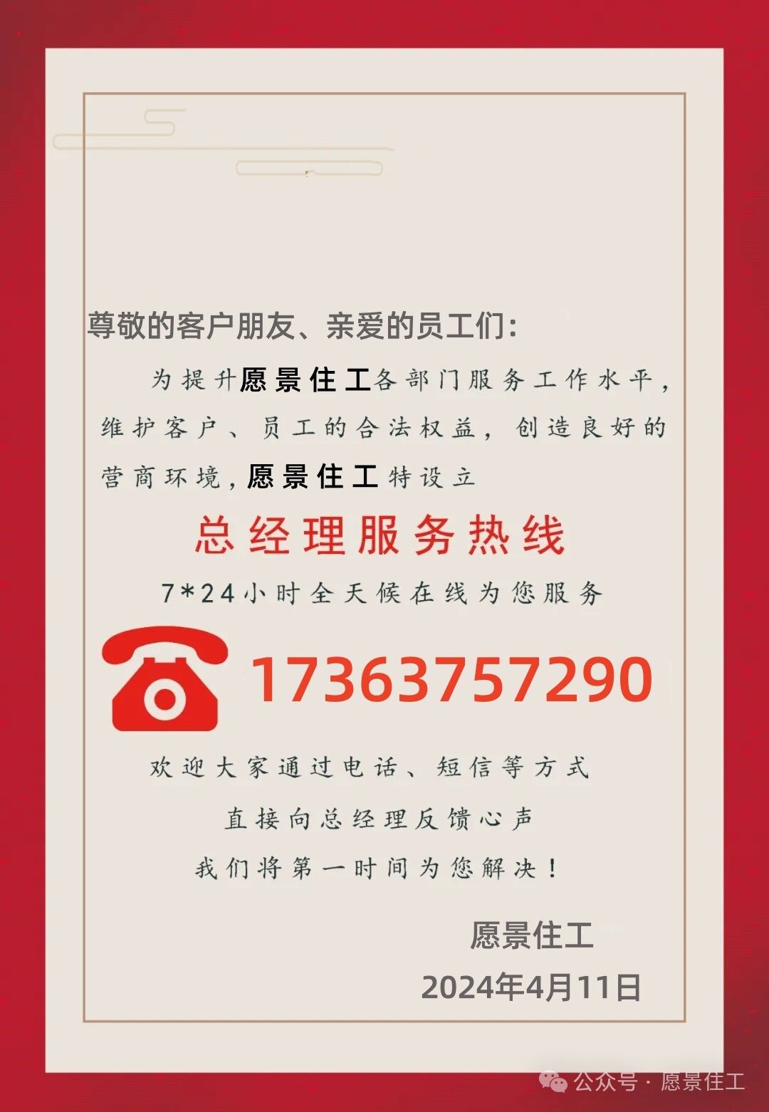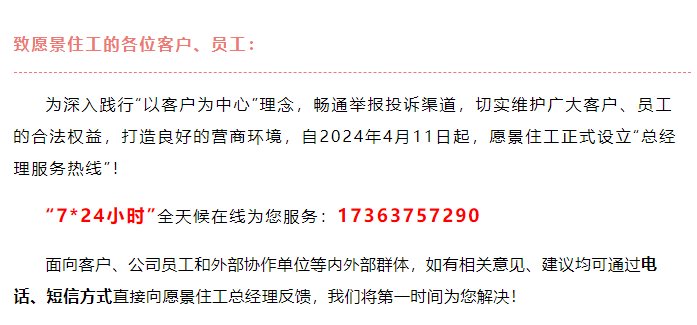 愿景住工-真敢啊!愿景住工開通24小時總經(jīng)理熱線!