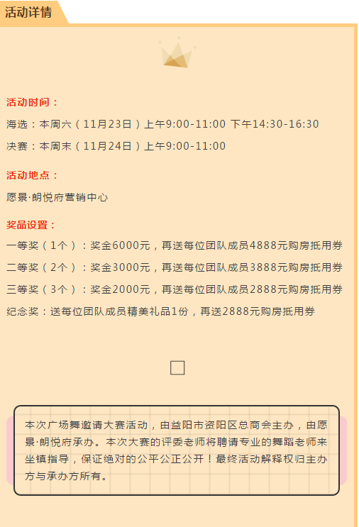 為慶祝中華人民共和國成立70周年,大力弘揚(yáng)優(yōu)秀傳統(tǒng)文化,豐富群眾精神文化生活,讓廣大群眾營造熱烈喜慶、文明和諧的文化氛圍,經(jīng)益陽市資陽區(qū)總商會同意,愿景·朗悅府特舉辦益陽市資陽區(qū)“愿景朗悅府杯”廣場舞邀請賽。