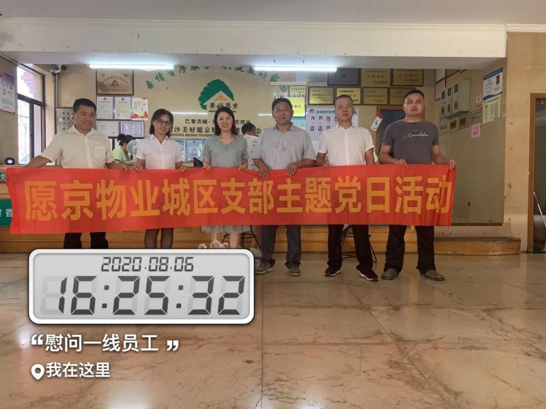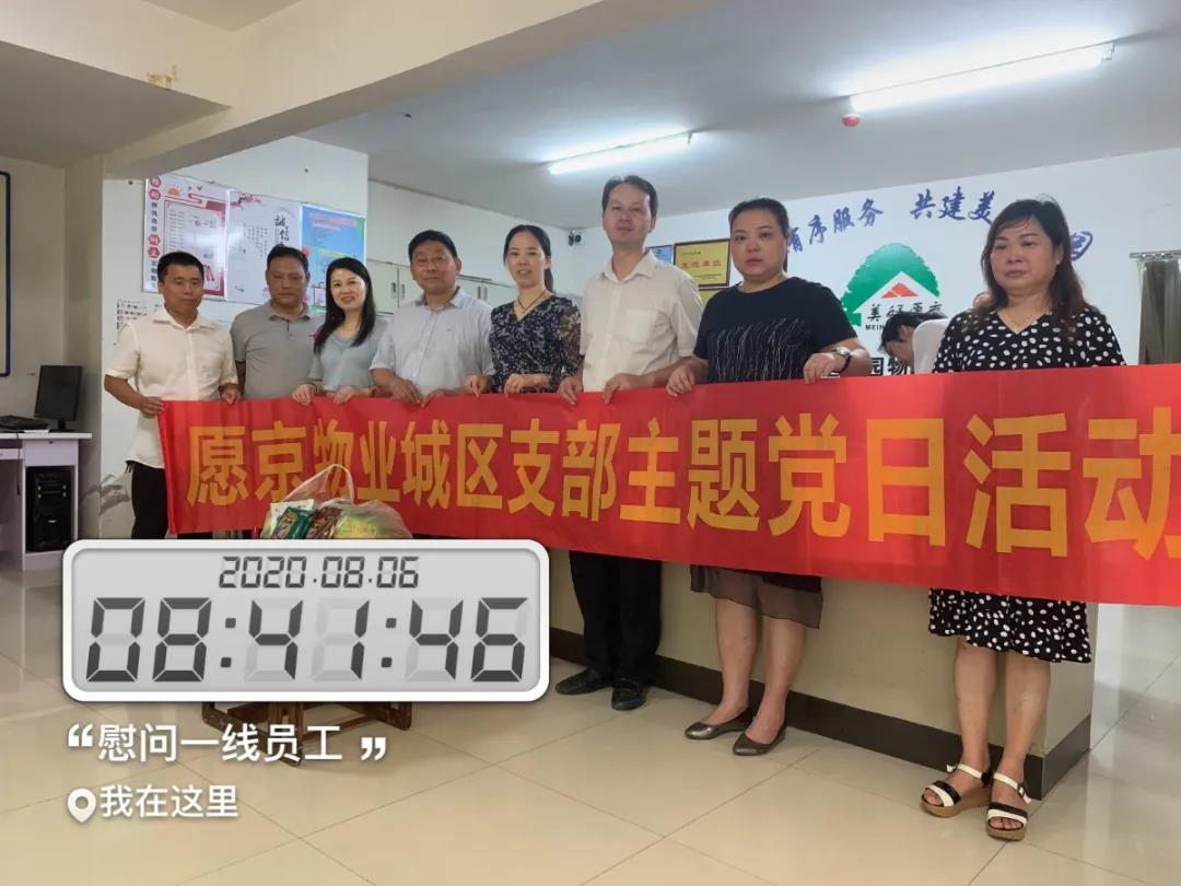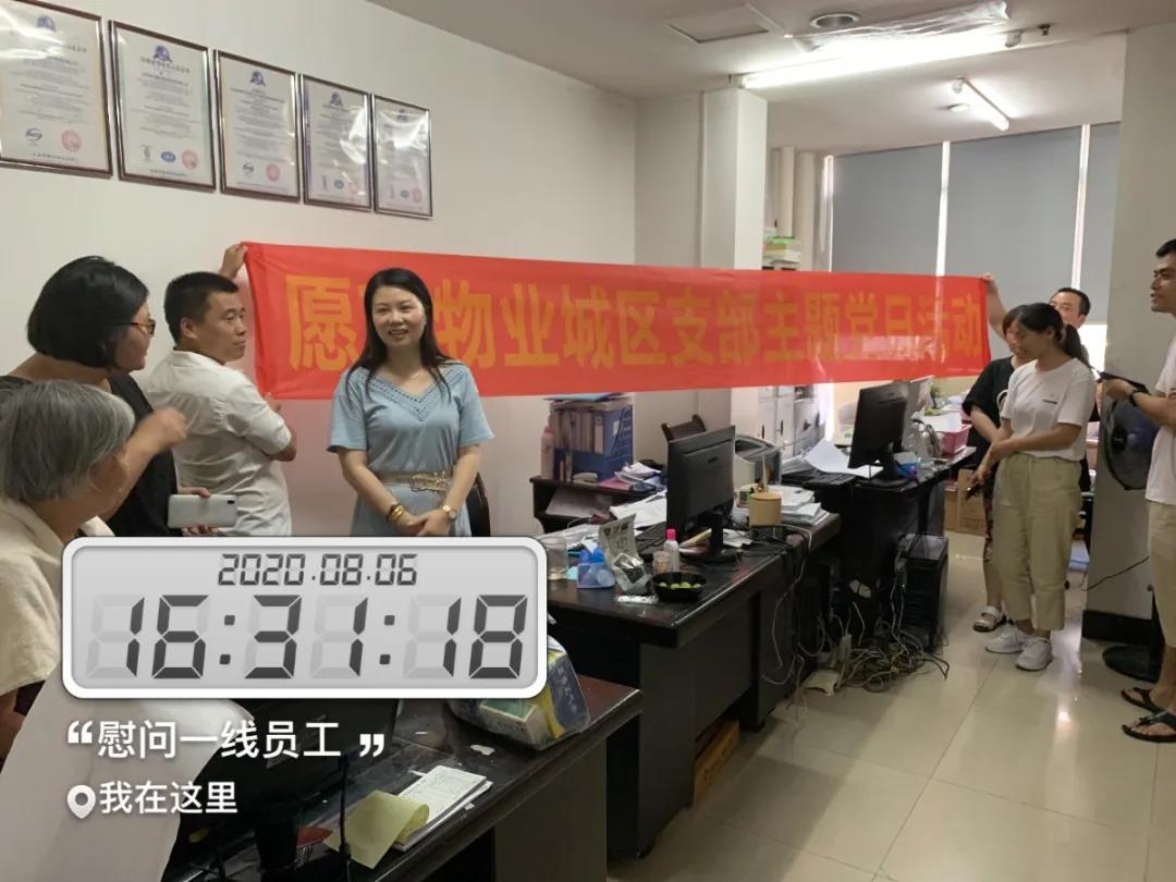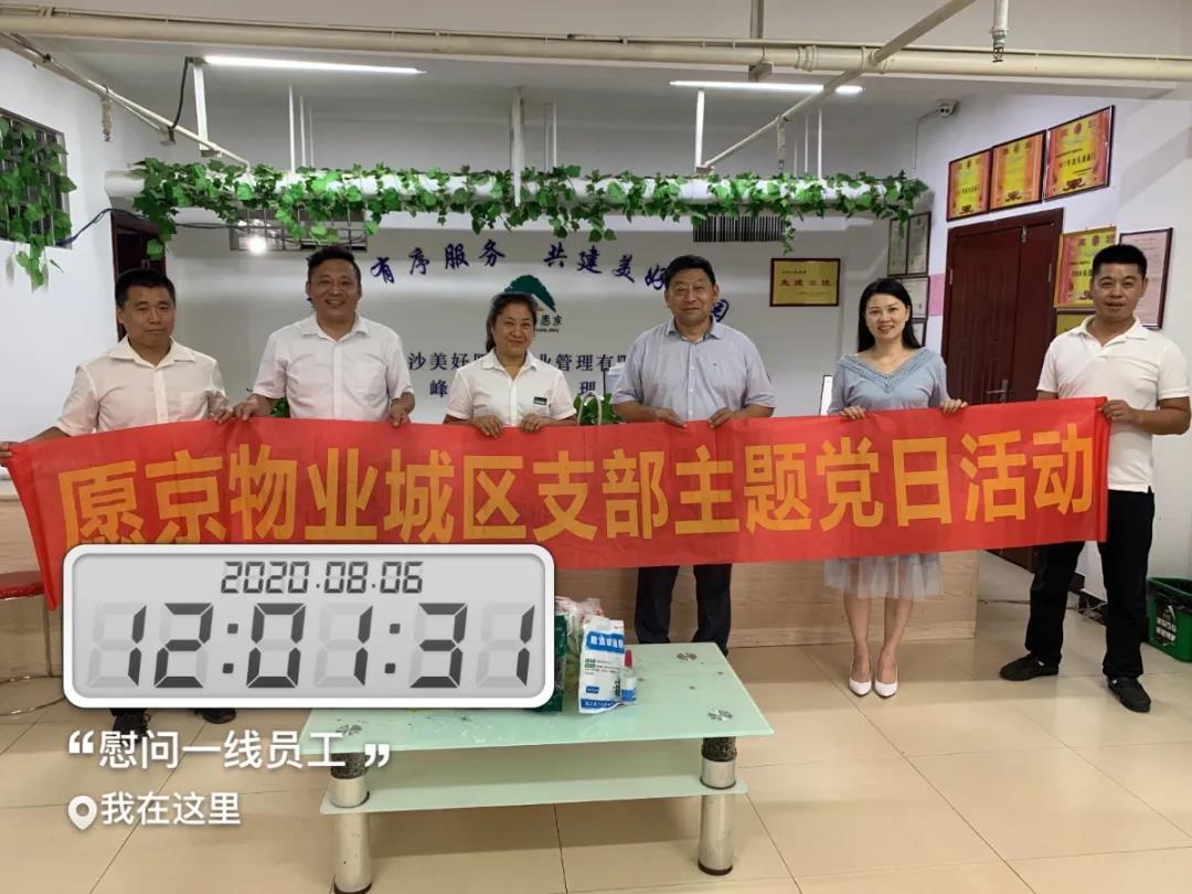 為保障員工的身體健康,2020年8月,長沙美好愿京物業管理有限公司城區黨支部易楊書記、組織委員甘正軍同志、宣傳委員唐蘭霞同志和星沙黨支部穆曉寶書記、組織委員姜賽同志、黨員張森林同志開展了夏季清涼物資發放慰問活動,走訪慰問高溫環境下堅守在崗位上的所有員工,為他們送上防暑降溫物品,感謝所有員工的辛勤付出!