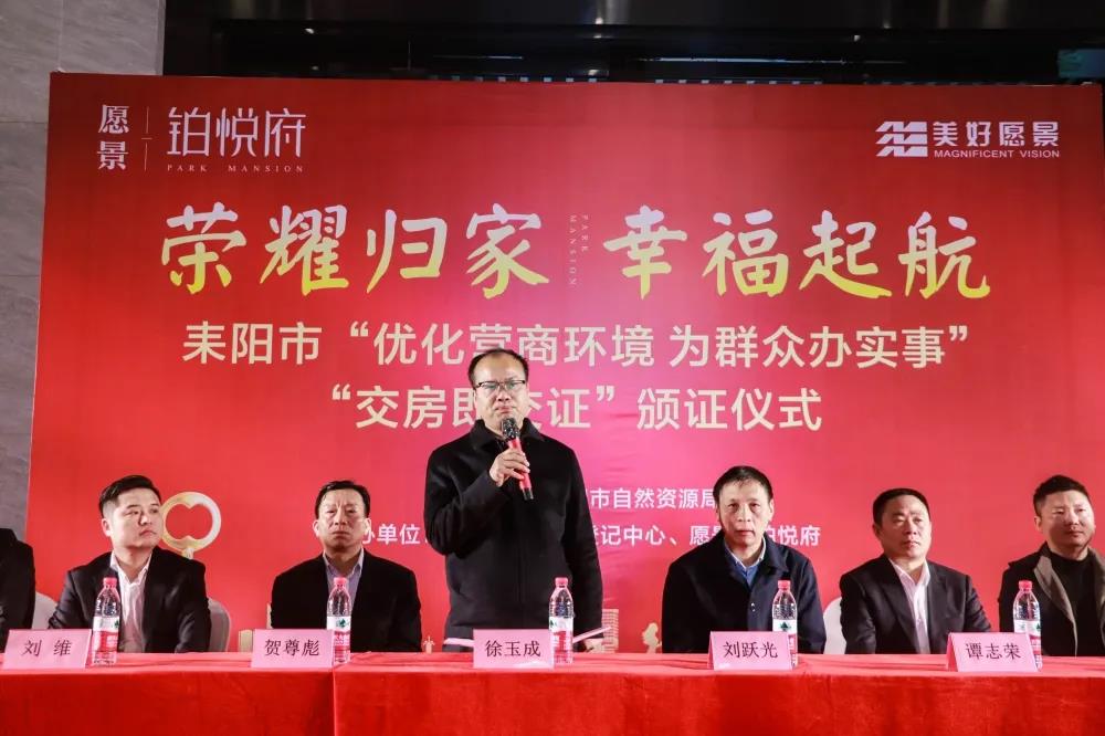 榮耀歸家,幸福啟航!11月3日,耒陽市“優化營商環境,為群眾辦實事”“交房即交證”首發頒證儀式在愿景·鉑悅府營銷中心隆重舉行。