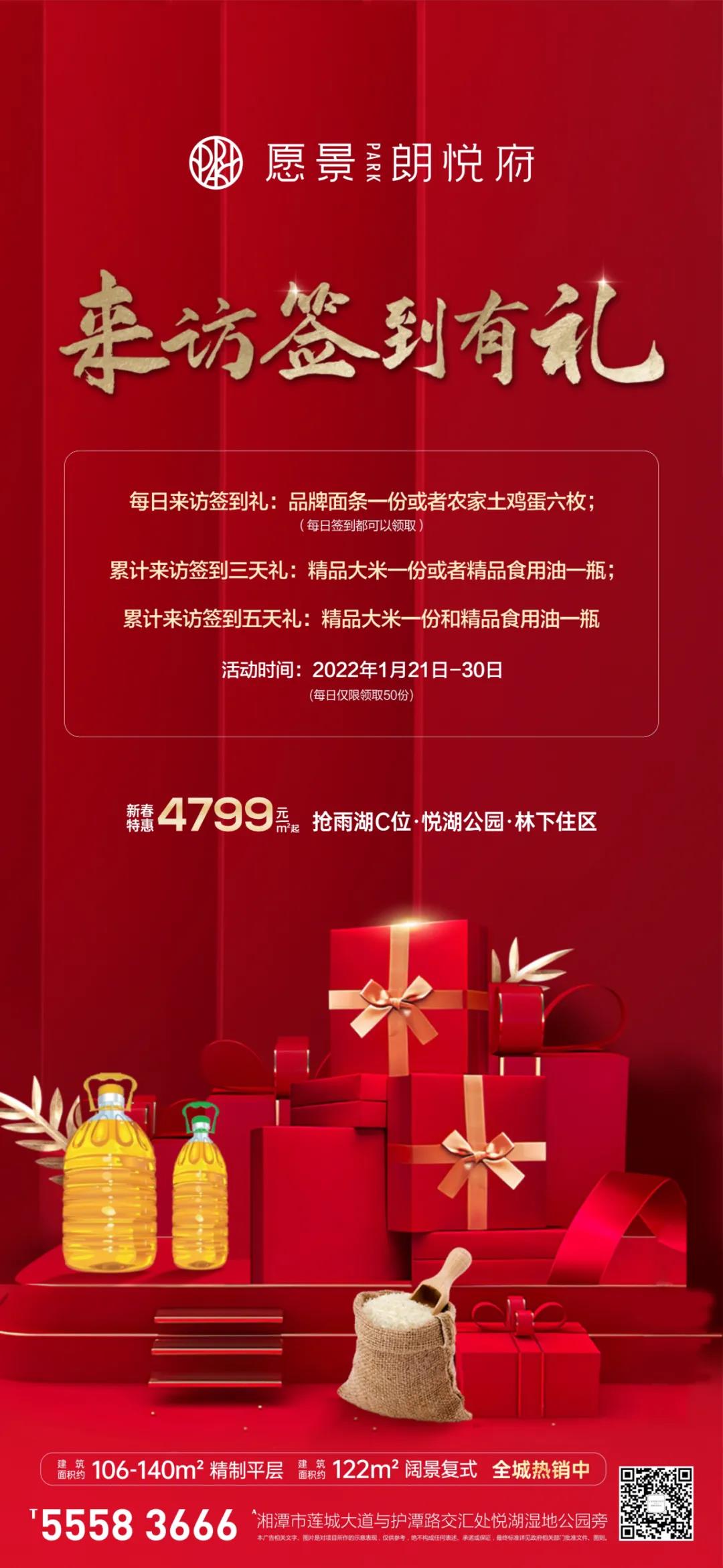 現場福利多多,好禮不斷!在本次新春書法活動期間,凡客戶來訪愿景·朗悅府營銷中心簽到,即送品牌面條1份或農家土雞蛋6枚(每日簽到都可以領取);累計來訪3天簽到,送精品大米1份或者精品食用油1瓶;累計來訪5天,送精品大米1份和精品食用油一瓶。